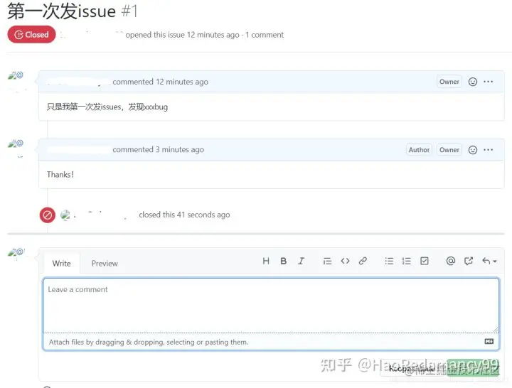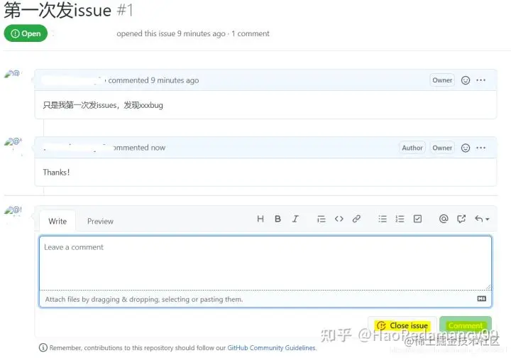 这里可以回复对方,点击Comment回复对方,回复完毕后,问题解决后点击Close issue可以关闭issue。(双方都可以关闭issue)
