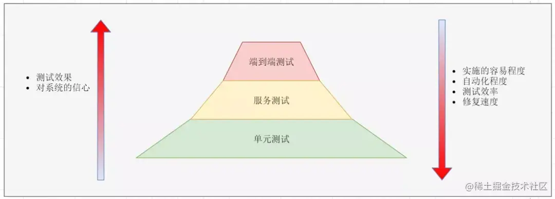 三种测试从上到下实施的容易程度递增,但是测试效果递减。端到端测试最费时费力,但是通过测试后我们对系统最有信心。单元测试最容易实施,效率也最高,但是测试后不能保证整个系统没有问题。