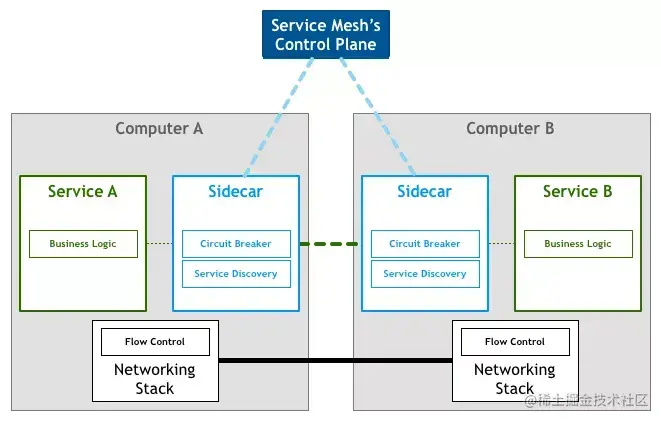 Sidecar只负责网络通信。还需要有个组件来统一管理所有sidecar的配置。在Service Mesh中,负责网络通信的部分叫数据平面(data plane),负责配置管理的部分叫控制平面(control plane)。数据平面和控制平面构成了Service Mesh的基本架构。