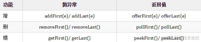 Deque 是两端都可以进出的,那自然是有针对 First 端的操作和对 Last 端的操作,那每端都有两组,一组抛异常,一组返回特殊值: