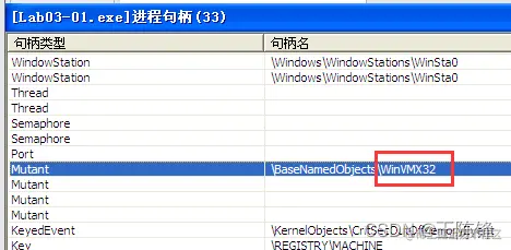 启动Pc hunter进行分析,我们在查看Lab03-01.exe进程句柄的时候发现,进程创建了一个名为WinVMX32 的互斥量。