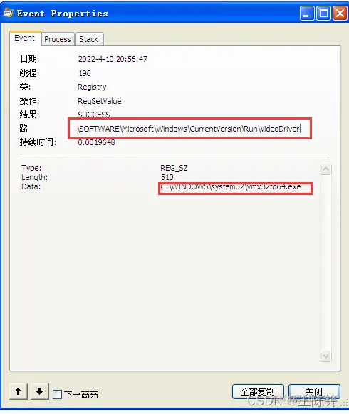 新创建的注册表项在HKLM\SOFTWARE\Microsoft\Windows\CurentVersion\Run位置,名为VideoDriver,在\Run文件夹中,用于系统启动时自动运行vmx32to64.exe。