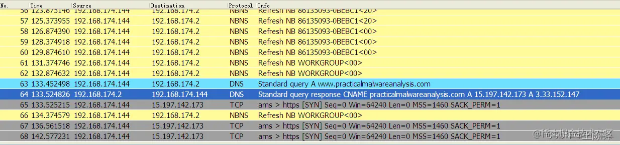 DNS中有一个对www.practicalmalwareanalysis.com的请求。这个可以作为网络特征。