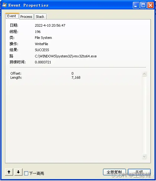点击第二条信息的属性,可以看到程序往C:\WINDOWS\system32\vmx32to64.exe写入7,168个字节的数据。