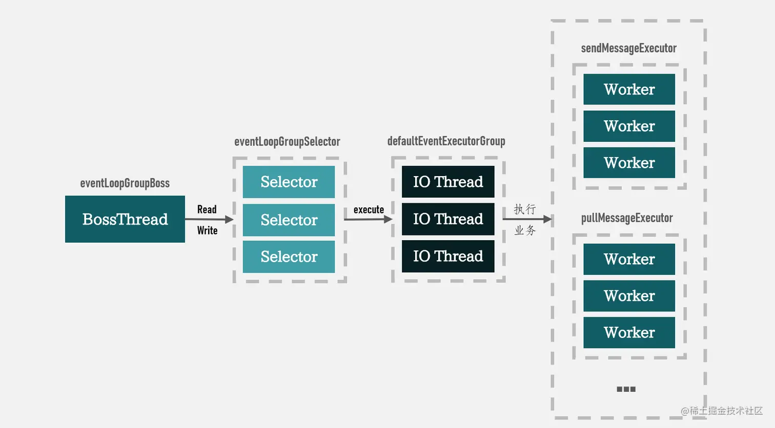 RocketMQ 服务端通讯使用经典的 Reactor 模式 ,服务端注册不同的业务处理器,而各个业务处理器可以绑定不同的线程池。