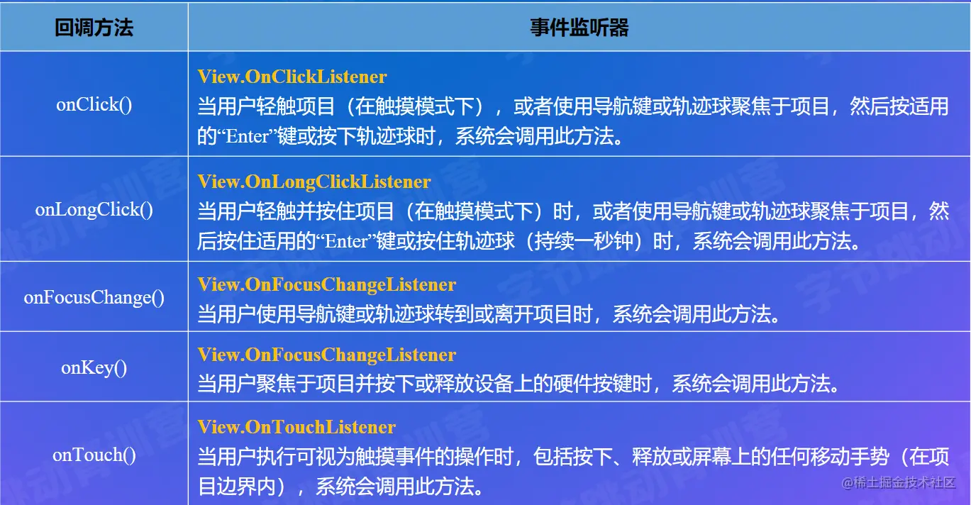 onTouch()和onClick()之类的方法的关系是前者包含后者,包括onLongClick()都是基于此封装的。onTouch()是他们的入口。触摸事件