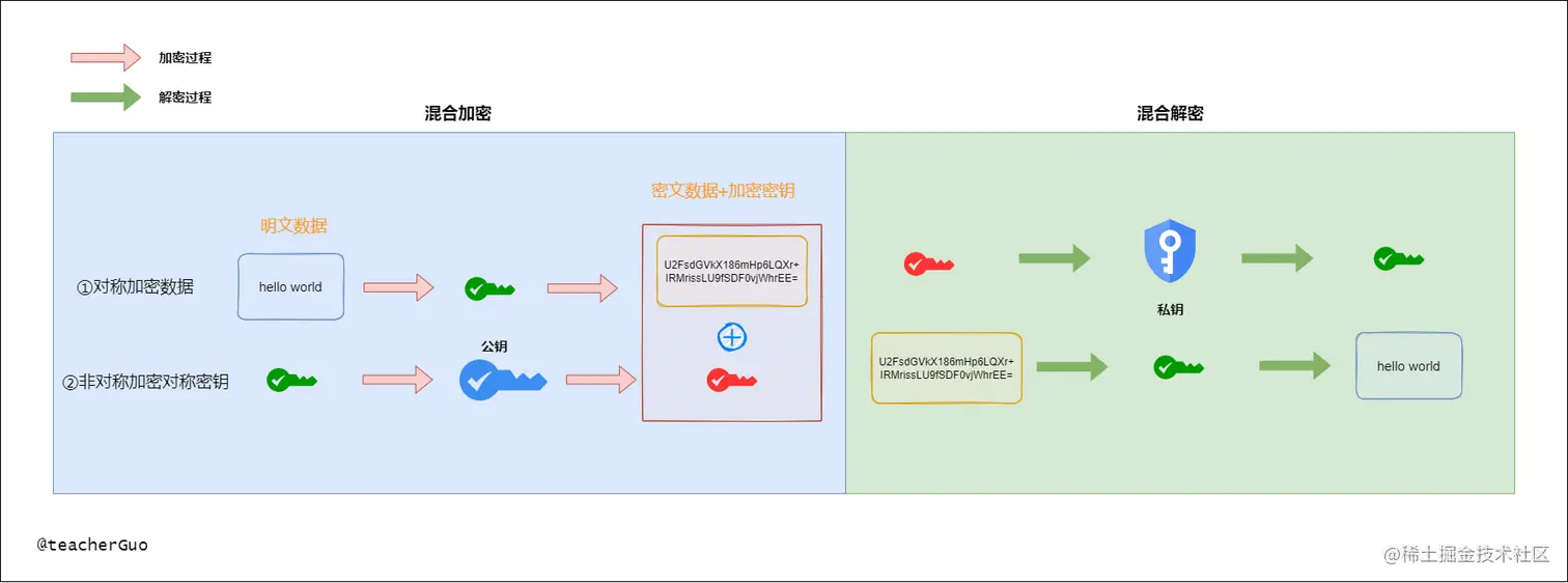 虽然非对称加密解决了密钥交换的难题,但是又带来了新的问题,那是否有其他的加密算法来解决上述的问题呢?答案显然是有的,我们可以使用将上述2种加密的方式混合一下取长补短。过程如下所示: