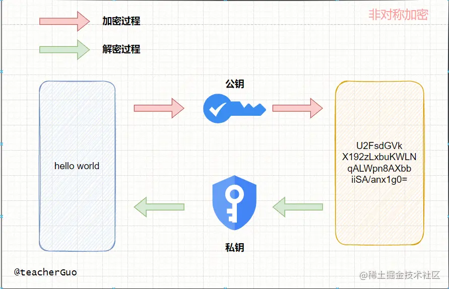因此就有了非对称加密可以用于解决以上 密钥交换 的问题。网站保管私钥,在网上分发公钥。公钥对原文加密,传输加密后的密文给网站,网站使用私钥解密出密文得到原文。黑客没有私钥,所以解不出密文。由于加密和解密使用的是两个不同的密钥,所以这种算法叫作非对称加密算法。