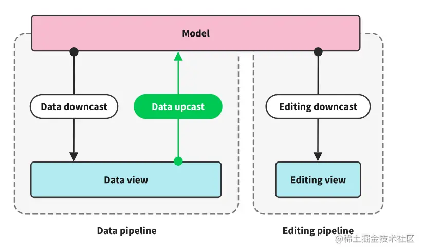CKEditor也提供了向下转化的通道——downcast,用来将模型转换为视图。大家进行视图编辑的时候,都会直接应用于模型,然后通过downcast转化为视图,间接来更新视图内容,而不是想象中的直接操作dom;当通过editor.getData() 获取编辑器内容的时候,触发的也是downcast。