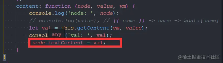 CompilerUtil['content'](node, content, this.vm);至于为什么是三个参数我就不多介绍了