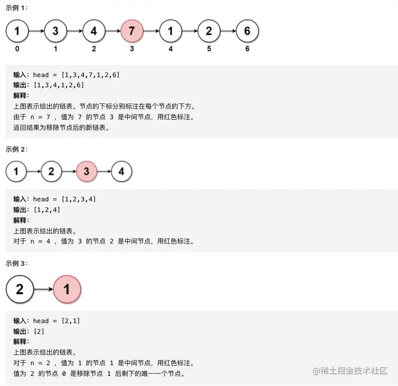 长度为 n 链表的中间节点是从头数起第 ⌊n / 2⌋ 个节点(下标从 0 开始),其中 ⌊x⌋ 表示小于或等于 x 的最大整数。