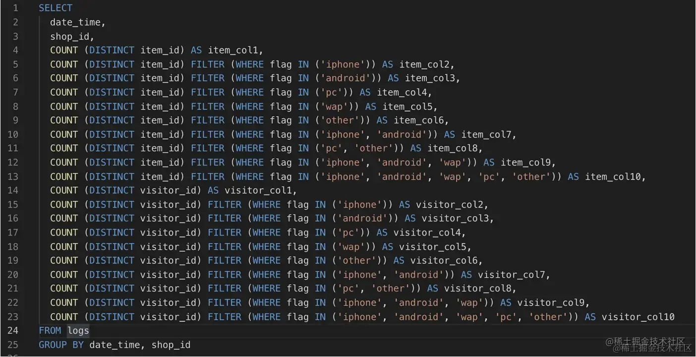 在SQL中,我们有一种方式可以在聚合函数上添加一些filter,如下面的SQL所示: