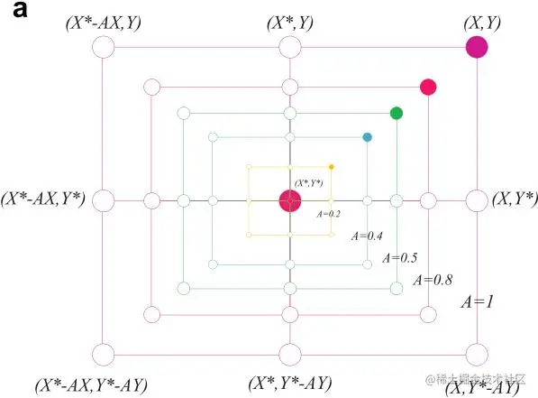 - 收缩包围机制:通过降低式(3)中 a ⃗ \vec{a} a 的值实现。注意 A ⃗ \vec{A} A 的波动范围也通过 a ⃗ \vec{a} a 降低,换句话说, A ⃗ \vec{A} A 是一个区间[-a,a]内的随机值,a 随着迭代进行从 2 降为 0。设置 A ⃗ \vec{A} A 中的随机值在[-1,1]之间,搜索代理的新位置可以定义为代理原始位置与当前最优代理位置之间的任意位置。图 3a 显示了 2D 空间中当 0 ≤ A ≤ 1 0 \leq A \leq 1 0≤A≤1 时从 ( X , Y ) (X,Y) (X,Y) 靠近 ( X ∗ , Y ∗ ) (X^{*},Y^{*}) (X∗,Y∗) 所有可能的位置。这种机制本质上就是包围捕食。