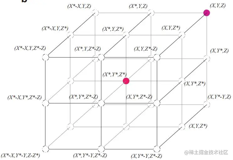 图 2a 描述了等式(2)针对2D问题的基本原理,搜索代理的位置 ( X , Y ) (X,Y) (X,Y)可以根据当前最优解的位置 ( X ∗ , Y ∗ ) (X^{*},Y^{*}) (X∗,Y∗)进行更新,通过调整向量 A ⃗ \vec{A} A 和 C ⃗ \vec{C} C 的值,可以找到相对于当前位置下一时刻最优代理附近的不同地方。在 3D 空间中搜索代理可能的更新位置如图 2b。通过定义随机向量 r ⃗ \vec{r} r ,可以到达图 2 中所示关键点之间的搜索空间内任何位置,因此等式(2)允许任何搜索代理在当前最优解的邻域内更新其位置,从而模拟了鲸鱼的包围捕食。