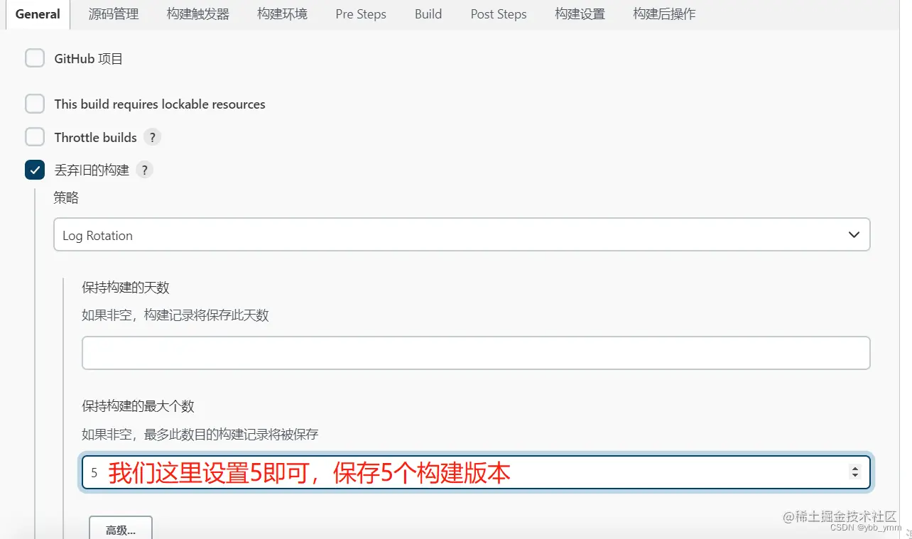 保留5个构建版本(这里可根据自己服务器性能及存储来确定我们的构建版本保留数量)