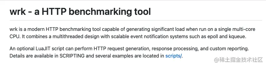 另外,还有一款很好用的开源性能测试工具:wrk。也许很多人都没有听说过,他是一款轻量级性能测试工具,采用网络异步IO模型,使得系统使用很少的线程模拟大量的网络连接以增大并发量,只支持http协议类型请求,官网文档是这样描述的: