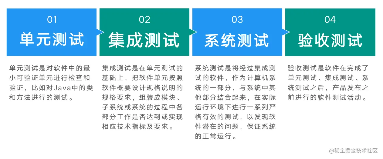 通常软件测试被分为四个阶段:单元测试、集成测试、系统测试和验收测试。
