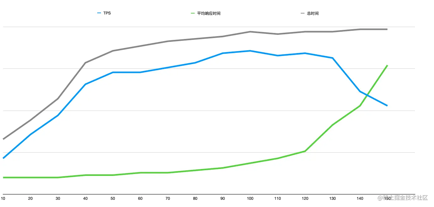 - 120以上,这个区间叫严重压力区间。在这个区间明显看到TPS向下的拐点,平均响应时间也急速上升,在这种情况下,会导致有些用户无法忍受等待的时间而放弃。