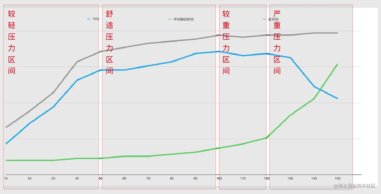 - 较轻压力区间的性能面积越大,说明系统的处理能力越强。