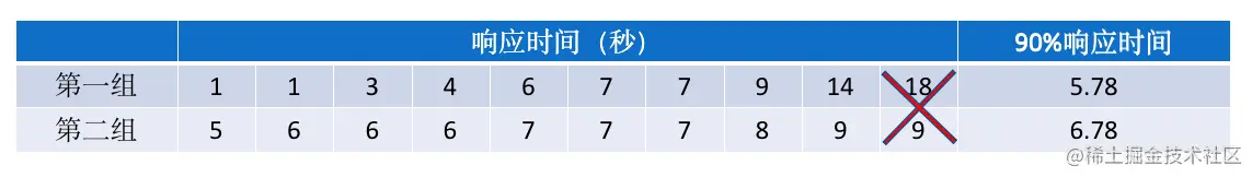 通过上面的图,我们可以看出,有两组测试数据,他们的平均响应时间都是7,那么你们认为哪次结果更理想呢?现在我们通过上面的计算方式,计算一下90%响应时间。