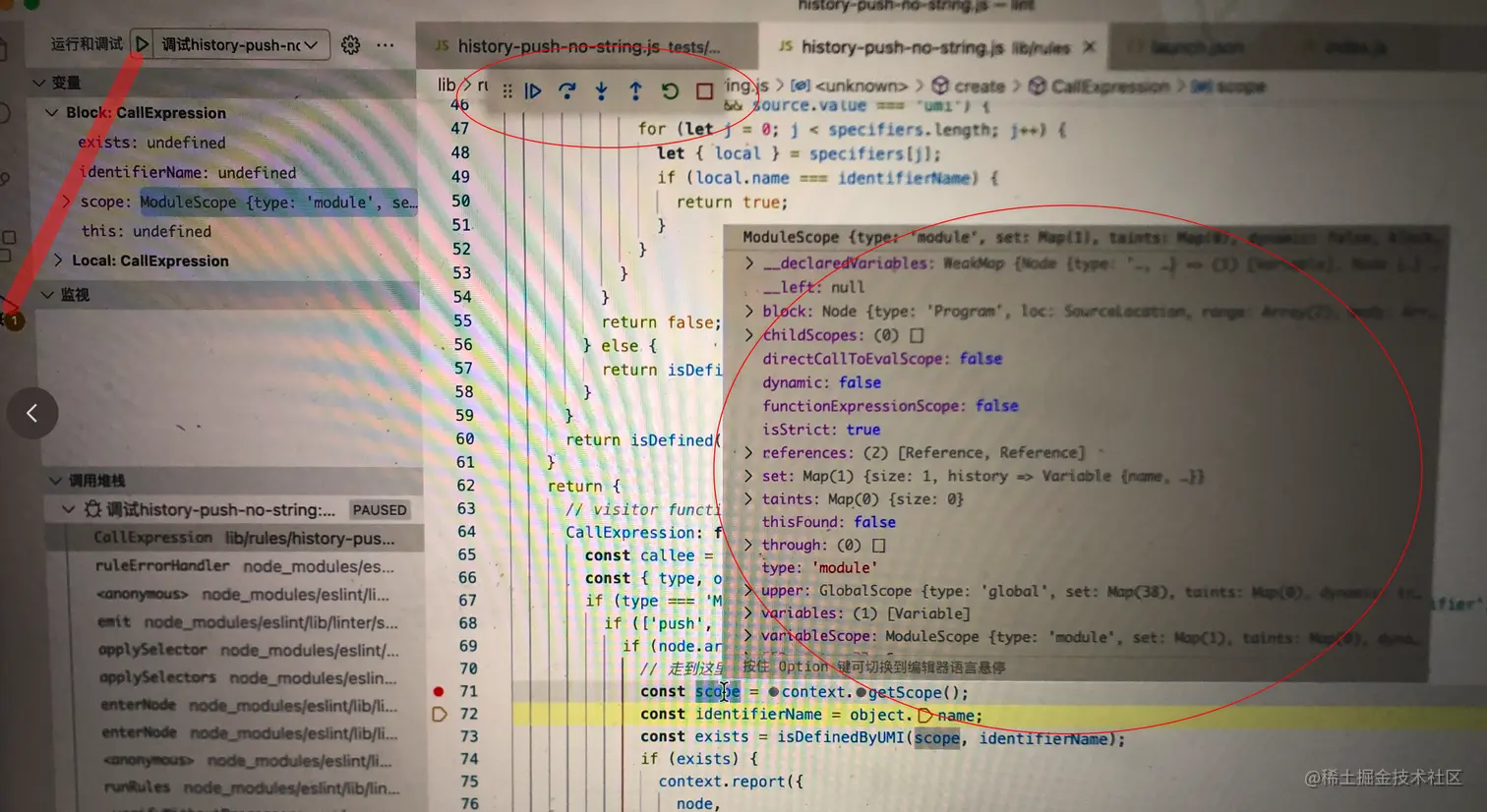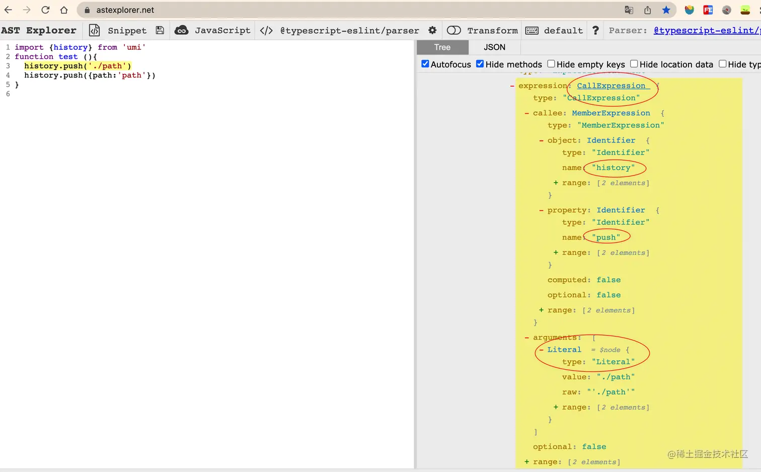 如下图可以看到,history.push的关键调用类型为CallExpression,我们可以通过这个节点的type,name以及arguments的类型,来做判断