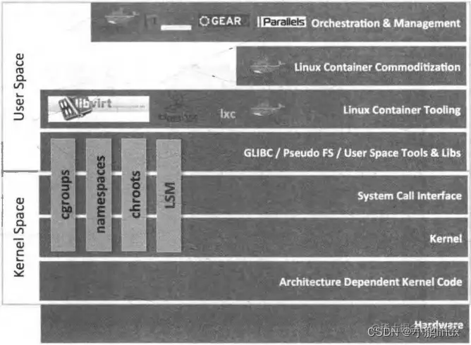 2008 年出现了 LXC (Linux Containers), 它是第—个最完善的 Linux 容器管理器的实现方案,是通过 Cgroups 和Linux 名字空间 namespace 实现的。 LXC 存在千 liblxc 库中,提供了各种编程语言APi实现。与其他容器技术不同的是, LXC 可以工作在普通的Linux 内核上,而不需要增加补丁。