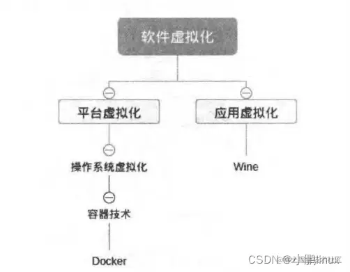相比之下,应用较为广泛的则是基于软件的虚拟化技术 而软件虚拟化又可以分为应用虚拟化(例如 Wine)和平台虚拟化(例如虚拟机),而本篇博文中的容器技术属于操作系统虚拟化,操作系统虚拟化又属于平台虚拟化中的一种,如下图: