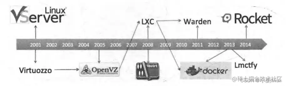 在前面的 Cgroups等技术出现以后,容器技术有了更快的发展,如下图简述了容器技术的发展史: