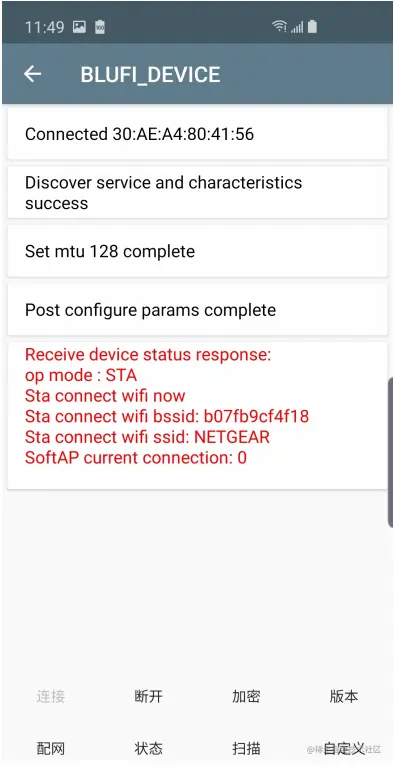 使用共享密钥和安全配置对通信数据进行加密和解密。 - 手机将BluFi中定义的帧格式部分定义的数据帧连同