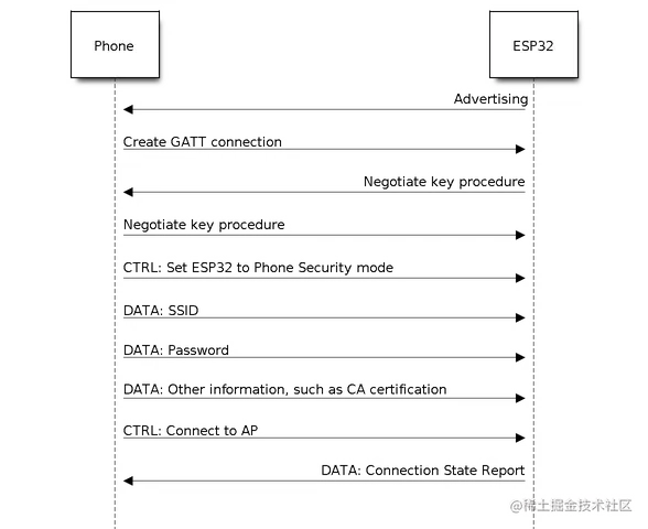 Wi-Fi配置信息发送到ESP32,包括SSID、密码等。 - 手机向ESP32发送Wi-Fi连接请求的控制帧。ESP32 收到此控制帧后,会认为基本信息的通信已完成,并准备