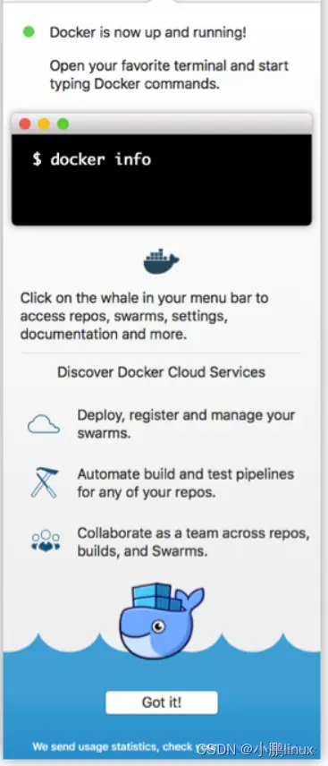 | 在载入 Docker app 后,点击 Next,可能会询问你的 macOS 登陆密码,你输入即可。之后会弹出一个 Docker 运行的提示窗口,状态栏上也有有个小鲸鱼的图标。 |