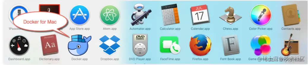 | 从应用中找到 Docker 图标并点击运行。可能会询问 macOS 的登陆密码,输入即可。 |