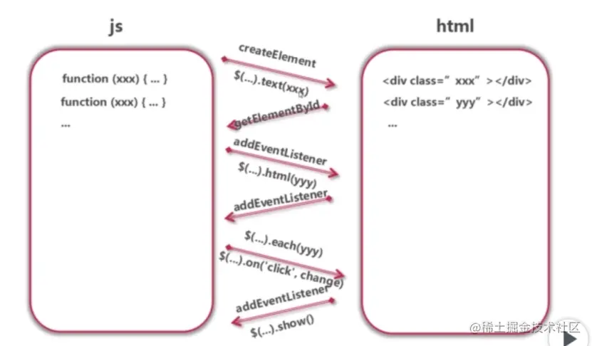 传统的js操作页面:在以前使用js操作页面的时候是这样的,需要操作某个html元素的数据,就的使用js代码获取元素然后在处理业务逻辑