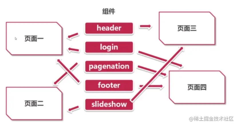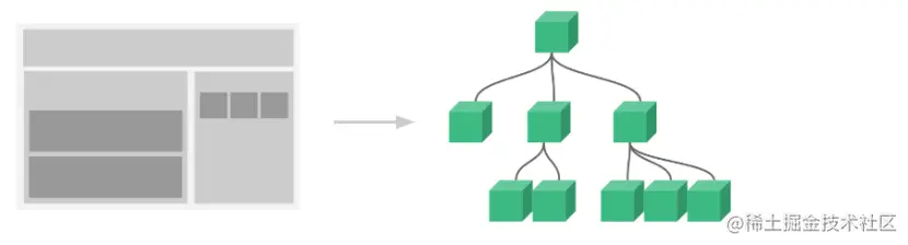 一个页面映射为组件树。划分组件可维护、可重用、可测试,也就是一个页面由多个组件组合而成