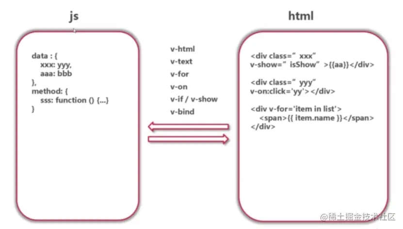 Vue.js 的核心是一个允许采用简洁的模板语法来声明式的将数据渲染进 DOM,初始化根实例,vue自动将数据绑定在DOM模板上