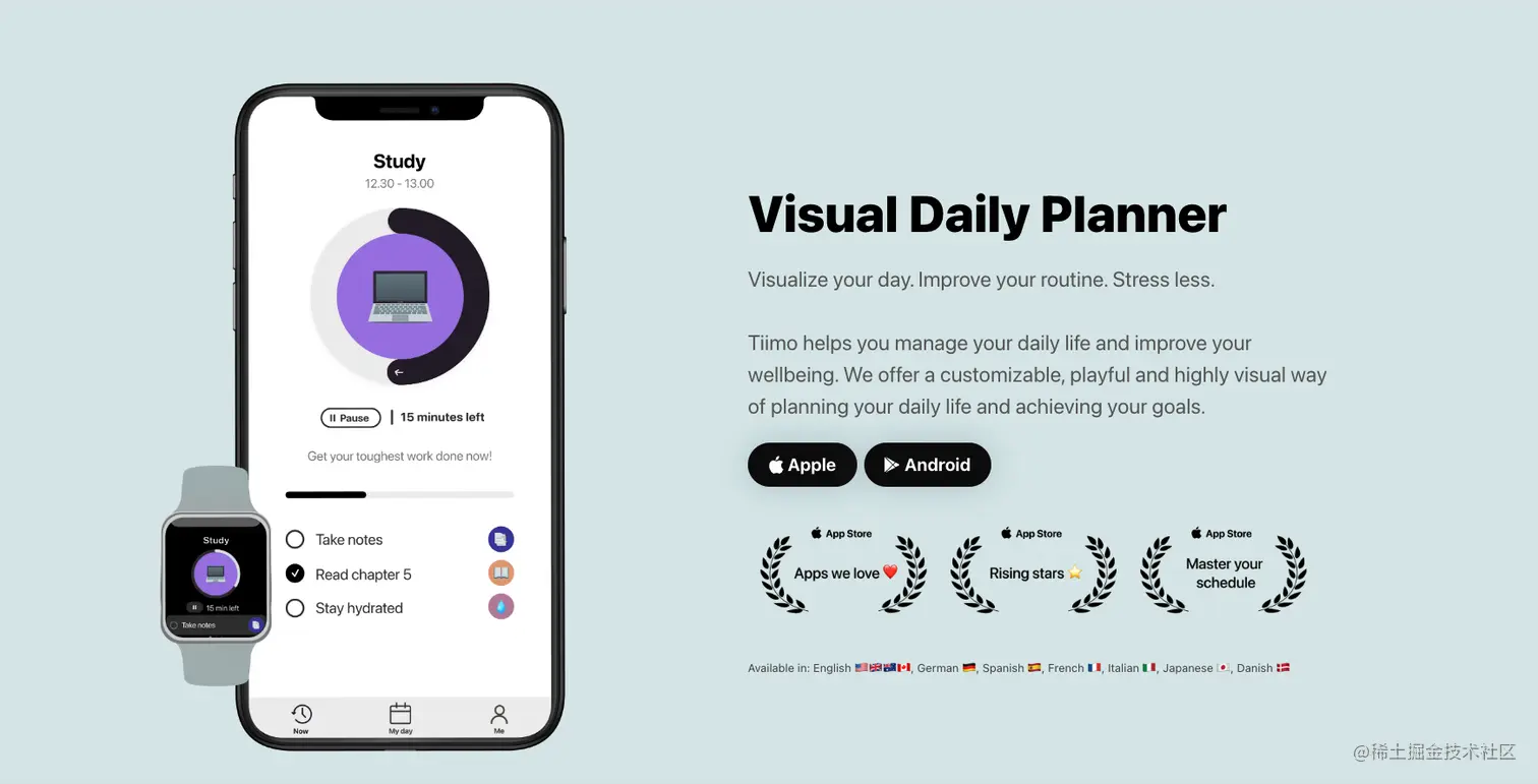 - Tiimo - 这是一个做的很精美的日程表和待办事项工具,用来规划改善你的日常生活并减轻压力。产品主界面是一个可视化的时间线,可以直接看到当天计划的事情概览。在晚上或早上计划一天要做的事情。设定明确的目标,这样每天做可以增强对你最重要的事情的认识,这个过程也可以让自己养成很好的习惯。支持 Android 和 iOS。