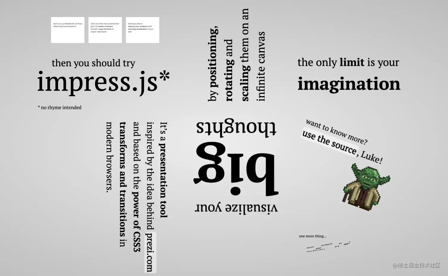 - impress.js - 这是一个 Prezi 演示文稿的前端框架,可以用 CSS 和 HTML 创建演示文稿 PPT。刚刚发布了 2.0 版。可以在这里看看效果案例。