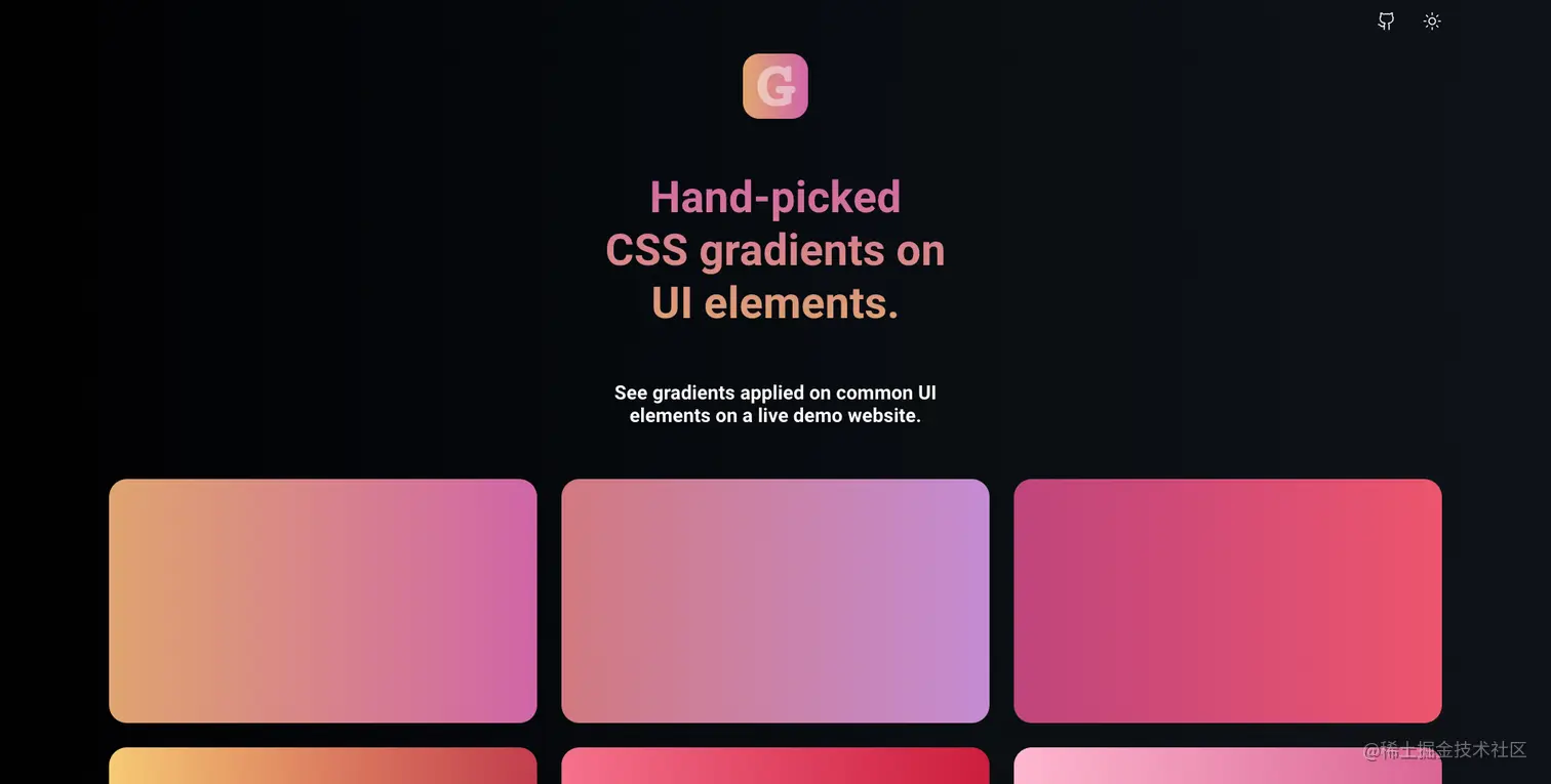 - Gradientos - 这个网站展示了很多渐变颜色,点击网站上的一个渐变颜色就可以看到作者展示的一些常见 UI 元素应用渐变的效果。开源的。