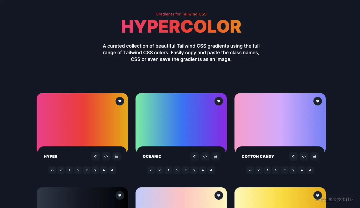 - HYPERCOLOR - 基于 Tailwind CSS 的一些渐变颜色集合。轻松复制和粘贴类名、CSS,也可以把渐变保存为图像。开源的。