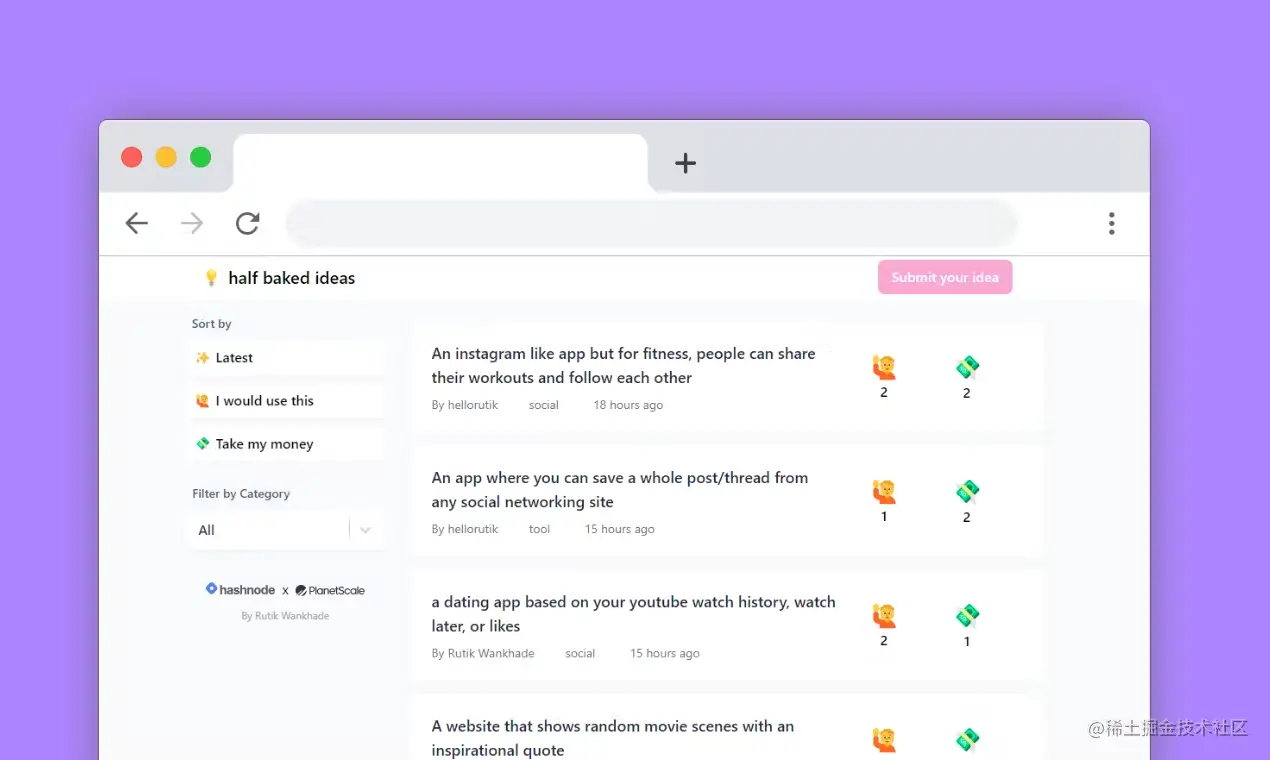- half baked ideas - “如果有一个应用程序可以xxxx”。这个网站可以提交你自己的想法,也可以给你喜欢的想法投票。是一个寻找灵感的好地方。