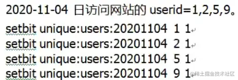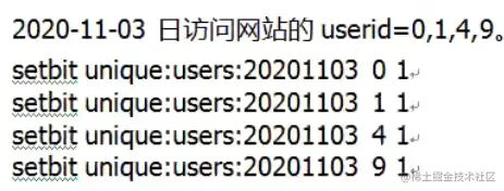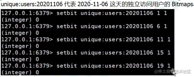 getbit key offset:获取 Bitmaps 中某个偏移量的值,获取键的第offset 为的值(从0开始)- 获取id = 8的用户是否在2020-11-06这天访问过网站,返回0说明没有访问过: