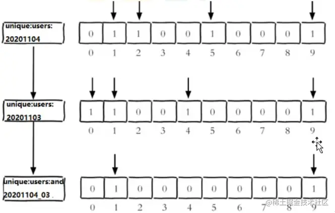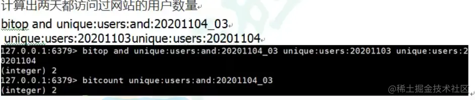 bitop and/or/not/xor destkey key...:bitop是一个复合操作,可以做多个bitmap的交集(and)、并集(or)、非(not)、异或(xor)操作并将结果保存在destkey中- 应用