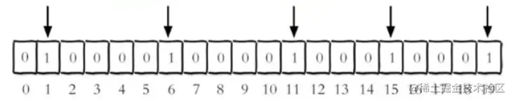 假设有20个用户,userid = 1,6,11,15,19的用户对网站进行了访问,那么对Bitmaps的初始化如下: