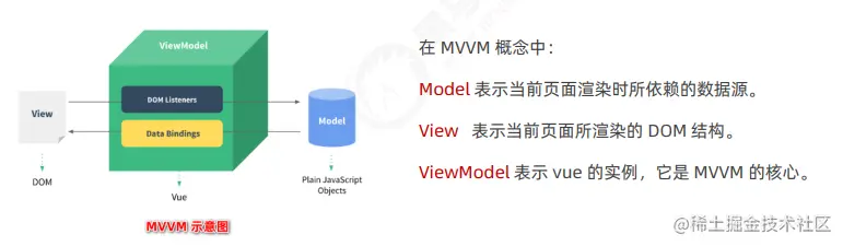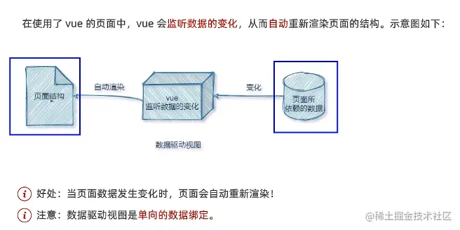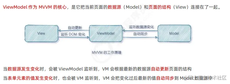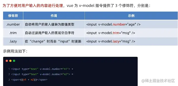 - v-model vue 提供了 v-model 双向数据绑定指令,用来辅助开发者在不操作 DOM 的前提下,快速获取表单的数据(只有表单元素可以绑定,其他元素无法更改内容)