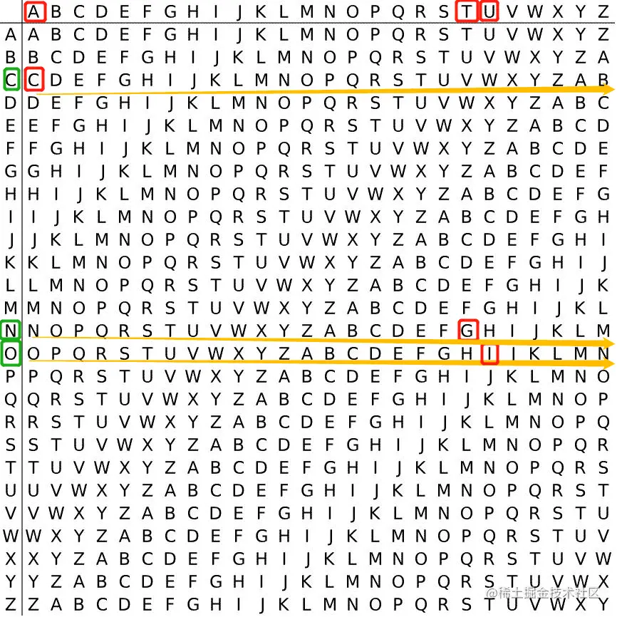 密钥第三个字母 T 对应 T 字母表,密文第三个字母 g 位于 n 列,得出明文第三个字母为 n;