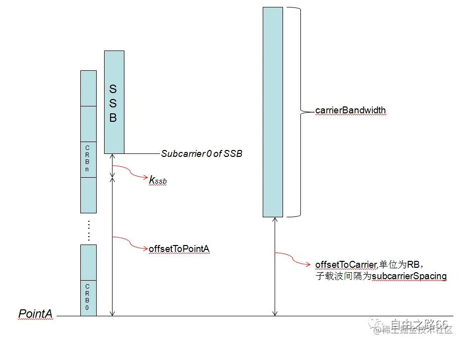 通过示意图来说明offsetToPointA的物理含义,其单位为RB,子载波间隔在FR1时候为15KHz,在FR2时候为60KHz。
