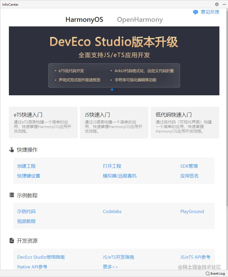 DevEco Studio基于开发旅程提供了一站式信息获取平台——信息中心(InfoCenter),可以直接在信息中心查阅文档、资源。