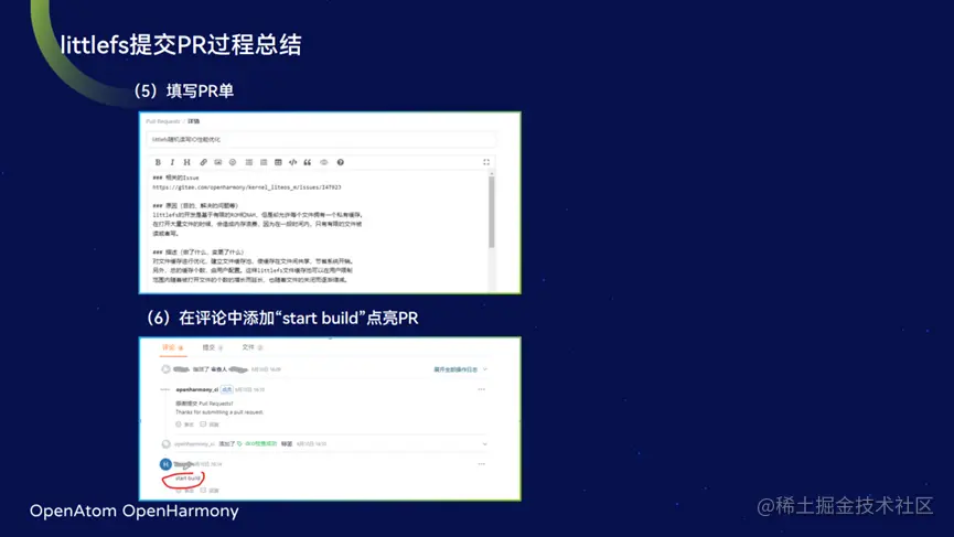 6、在评论中添加“start build”点亮PR。这里有一个特别注意的点,需要在评论中是手动填写“start build”这2个英文单词,目的是触发后续的门禁检测。这是OpenHarmony社区比较特别的一点,其它开源项目中所没有的。