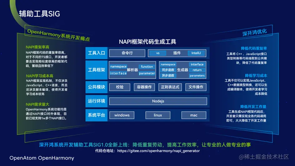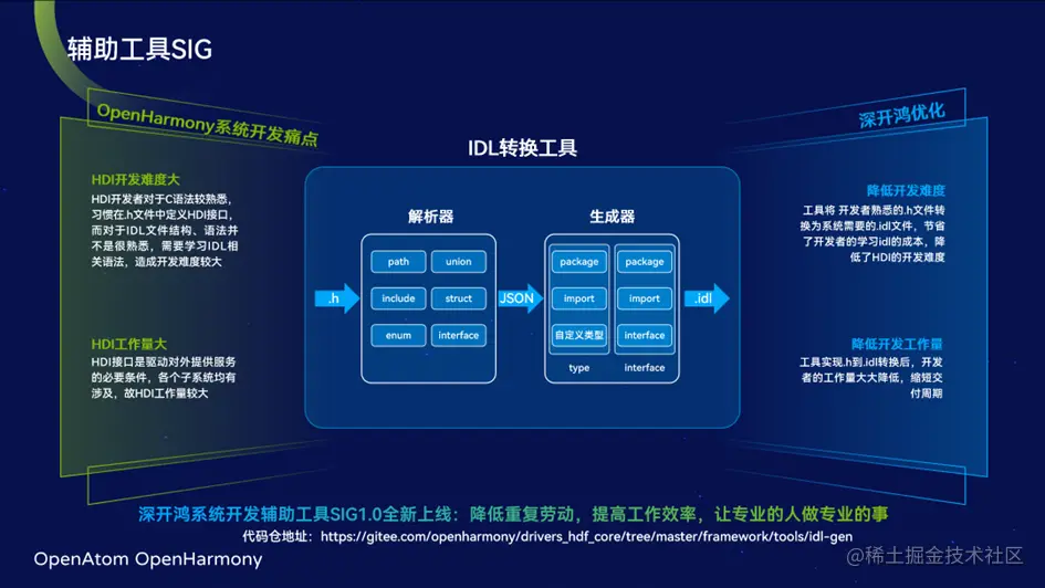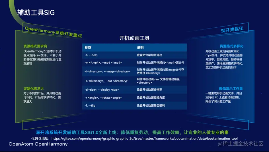 成立辅助工具SIG组的宗旨是“降低重复劳动,提高工作效率,让专业的人做专业的事”。NAPI框架代码生成工具、IDL转换工具和开机动画工具都是围绕着这个宗旨开发而成的。