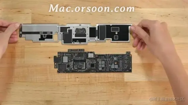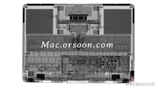 机身内部看起来就像是 MacBook Air 里面塞了一台 iPad 设计,其实不用感到特别意外,实际 macOS 与 iPadOS 设备都是采用相同 Apple Silicon 芯片架构,两款内部也可能会有共通类似设计和零件。最核心关键全集中在最顶部的主机板区块,外层采用金属防护罩保护。